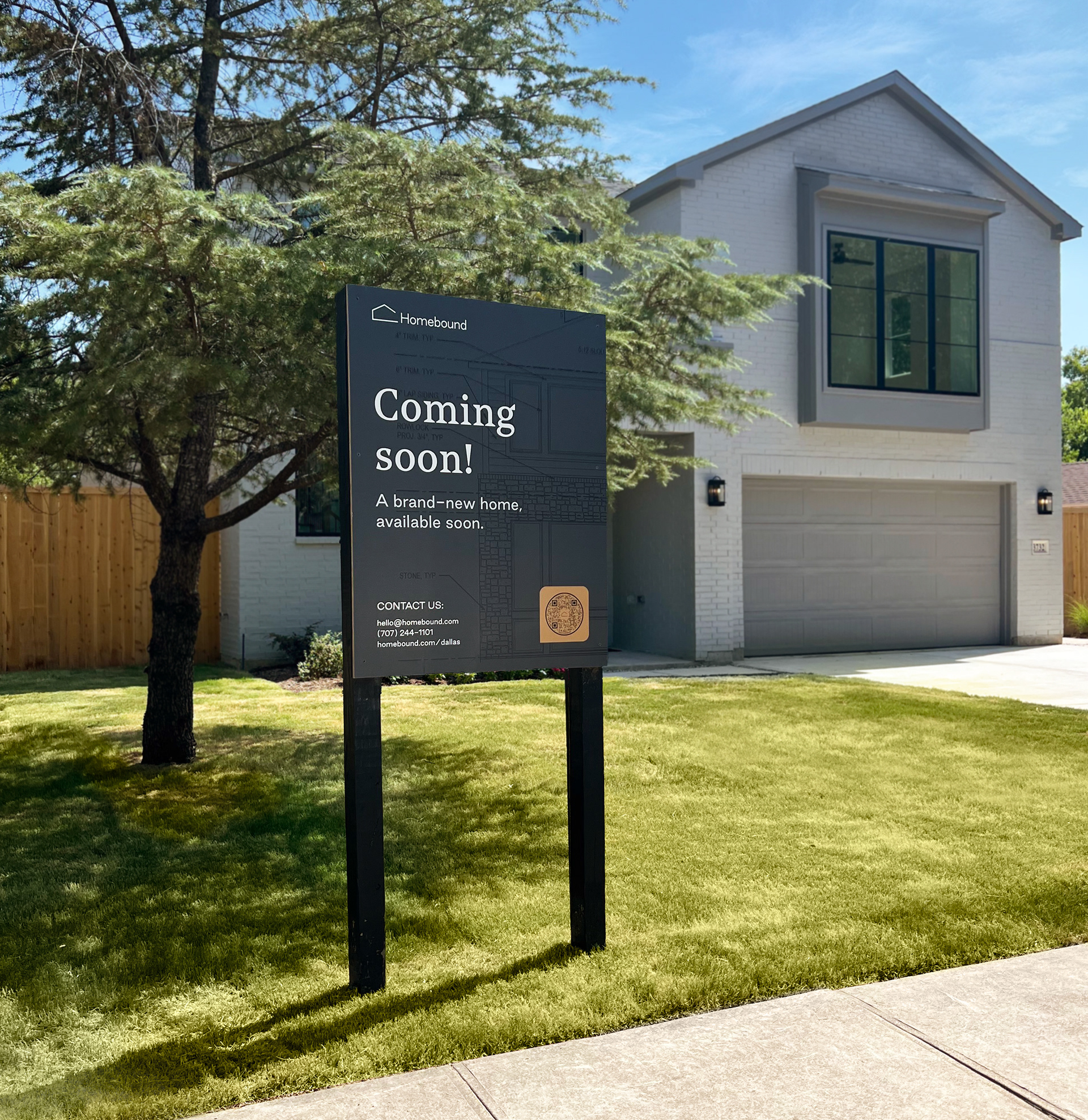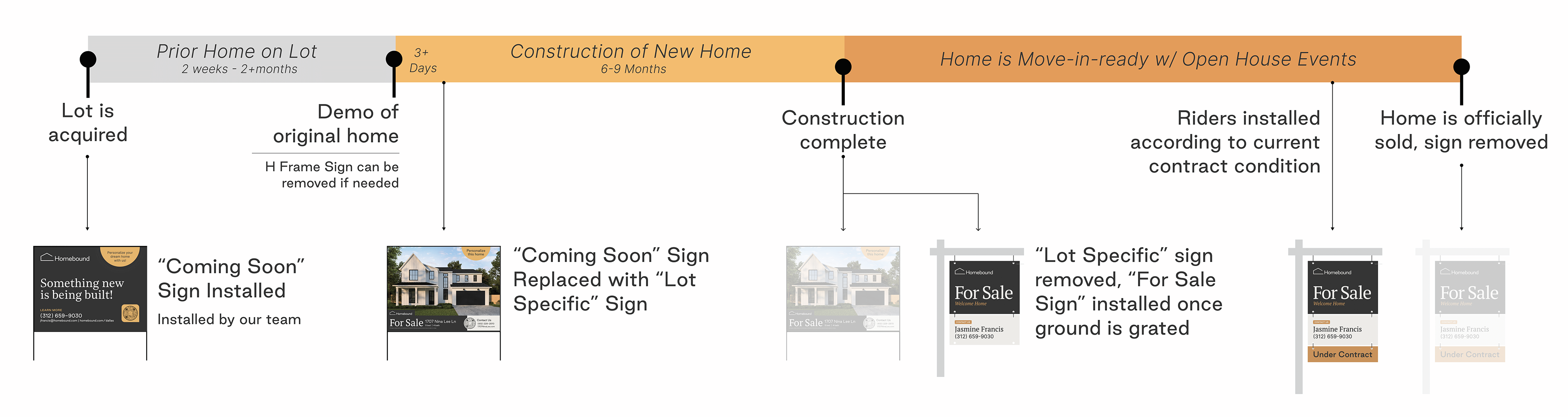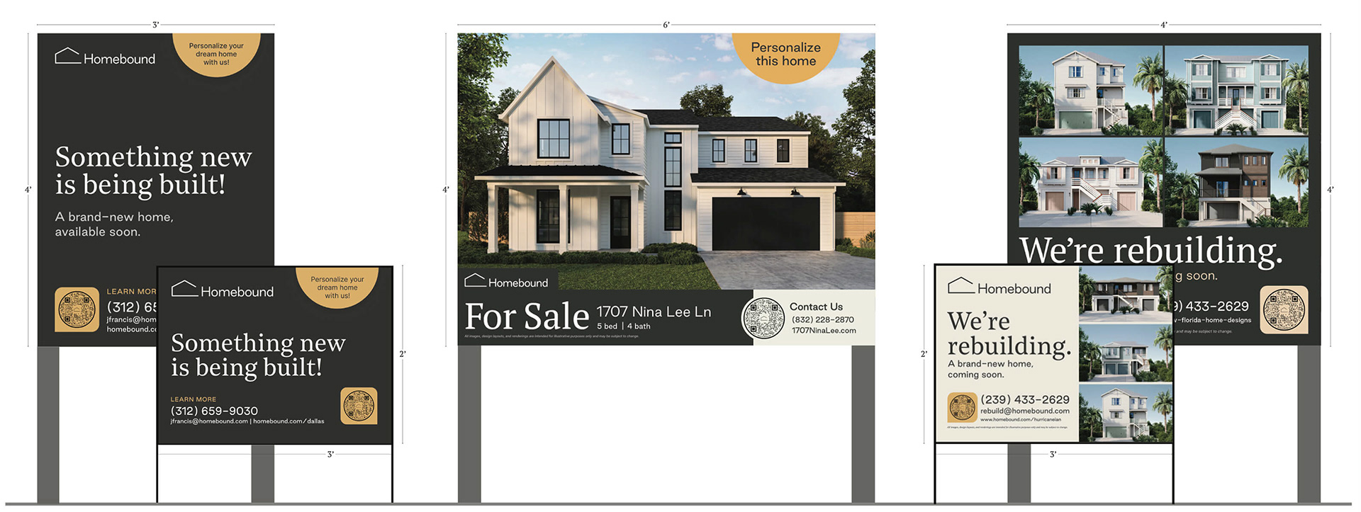Imagining the lifecycle as a book or story, the first sign must act as an introduction to Homebound and set the stage. Our Lot Specific sign, which includes a rendering of the soon-to-be home, is the very heart of the book, filling in the gaps and sparking intrigue. The last chapter brings it all to a close — house pun :)